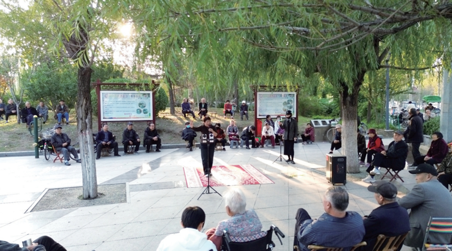 10月26日,在陽谷縣金水湖公園,縣老年大學的志愿者為游玩的群眾表演精彩戲曲,贏得陣陣掌聲?!?陳清林