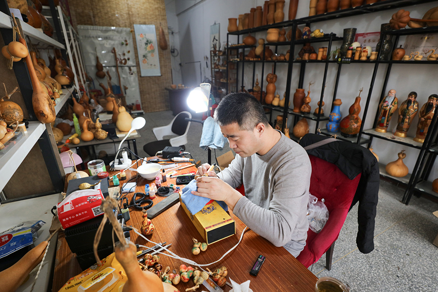 堂邑鎮葫蘆手藝人在雕刻葫蘆