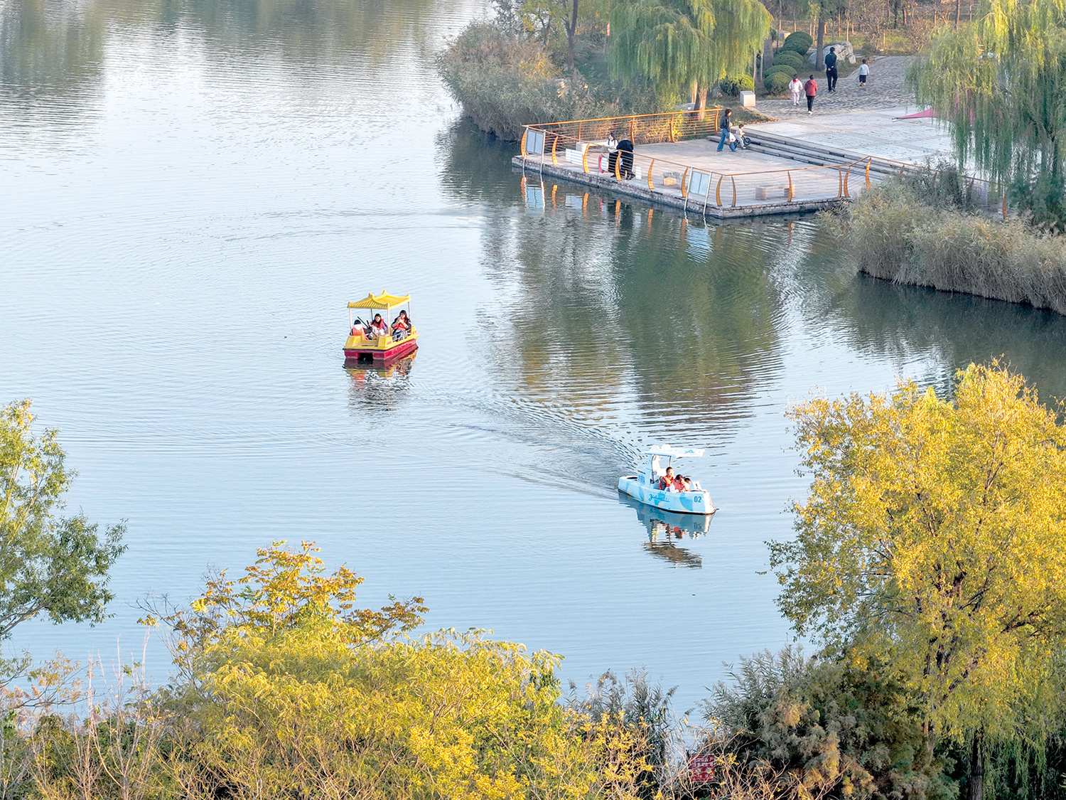 11月1日,游客在茌平區天鵝湖濕地公園游玩。該公園銀杏鎏金、紅楓似火,各色林木與清澈湖面交相輝映,人們紛紛前來欣賞斑斕景致,盡享美好時光。 ■ 馬紅坤
