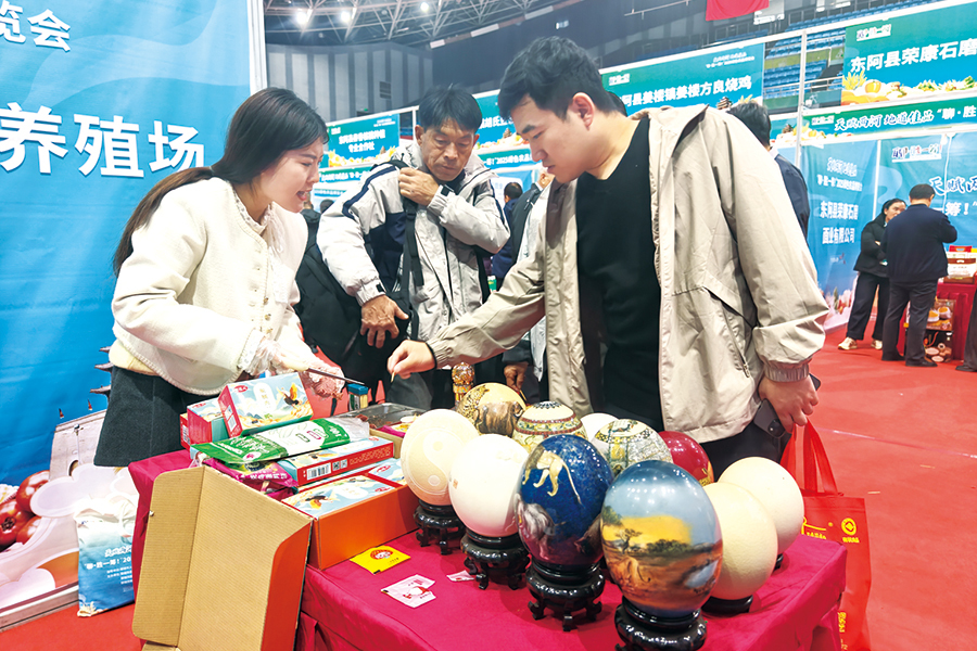 于集鎮(zhèn)興軍家庭特種養(yǎng)殖場展出的鴕鳥肉產(chǎn)品及鴕鳥蛋工藝品。尹騰淑 攝
